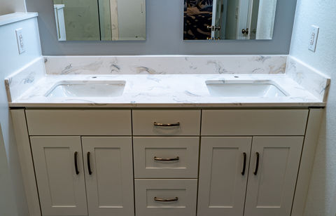 Premium vanity tops in cultured marble, granite, or TruStone™. Custom shapes, sizes, and integrated bowls available to suit any bathroom design.